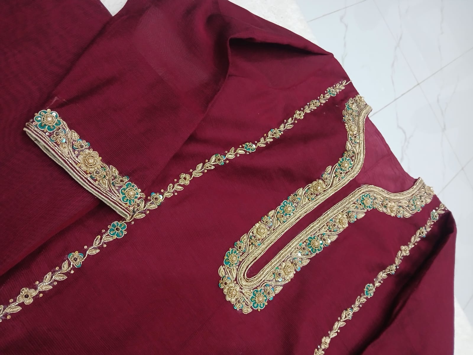 An elegant 3-piece stitched dress in a rich mehroon tone (customizable in any color), crafted from premium khadi net fabric (also customizable in any fabric of your choice). The outfit features intricate Zardozi work and delicate pearls, highlighted with a beautifully contrasting touch of sea-green sitara (sequins) that adds sparkle and charm.