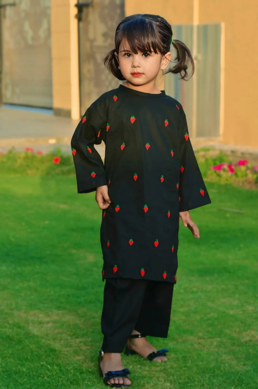 This three-piece outfit features a delicately embroidered kurti, paired with a flared gharara and a soft dupatta, all made from premium, breathable fabric that ensures comfort while enhancing charm. Every stitch reflects the essence of festive tradition, making it an ideal choice for your baby girl’s first Eid celebrations or family functions.
